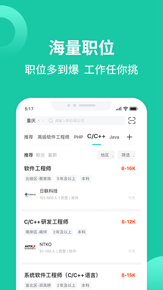 职位搜索:支持关键词、行业、薪资等多维度筛选职位,可保存搜索条件。