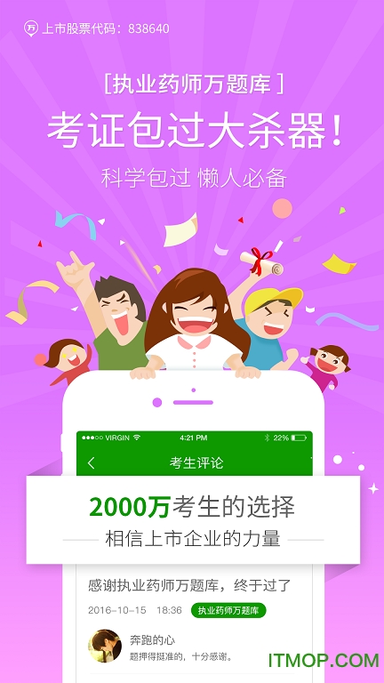 2017年度最受执业药师考试用户欢迎的医学类学习APP!百万执业药师考生的选择,数十万用户热评!安卓教育类医学排行榜头名!作为行业领先的备考平台,我们持续优化用户体验,提供最前沿的考试资讯和备考指导。平台采用智能算法为每位学员定制个性化学习计划,让备考更高效。如果你想和他们一样不看书就能快速通过考试,下载执业药师万题库吧!