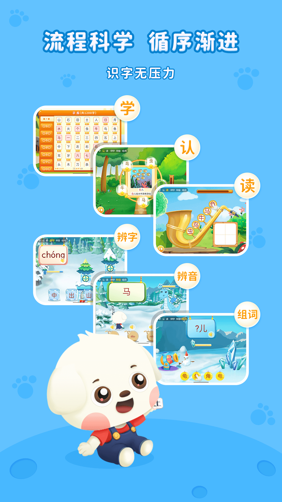 更方便的学习和复习功能:1200个识字课程分为240个小节,根据孩子自身识字量,个性化选择小节进行学习和复习课程,系统还会智能推荐适合的学习内容。