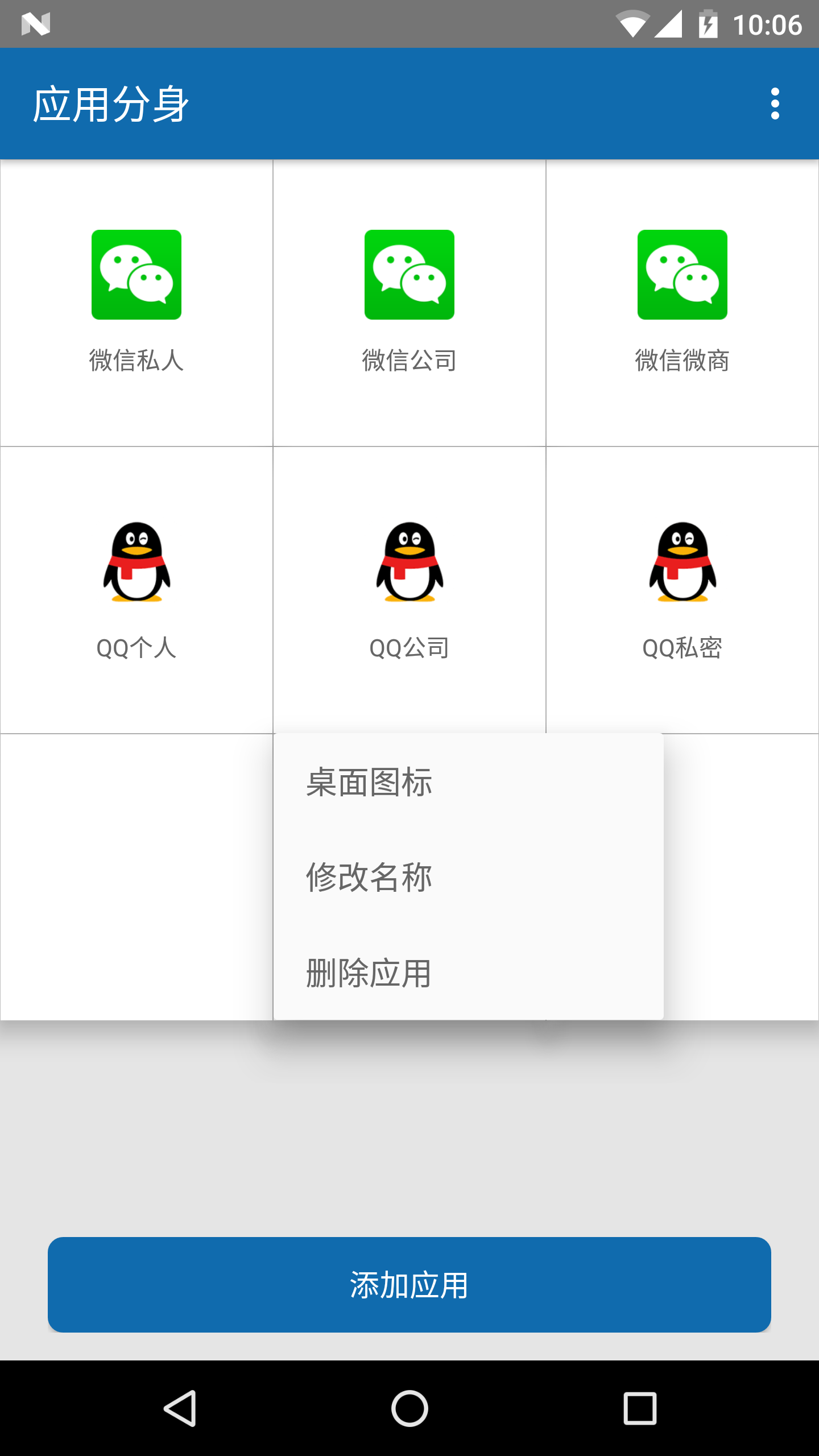 支持微信、QQ、微博等社交应用双开,最多可同时运行5个相同应用