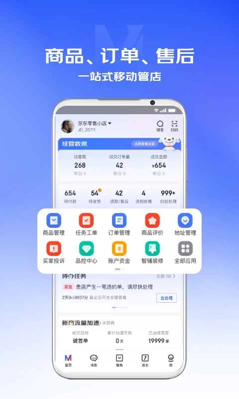 京麦:智能工作台整合店铺关键指标提醒、商品管理、交易数据、论坛互动等核心功能入口。个性化布局功能让商家可以自定义工作界面,快速访问最常用的功能模块,提升工作效率。