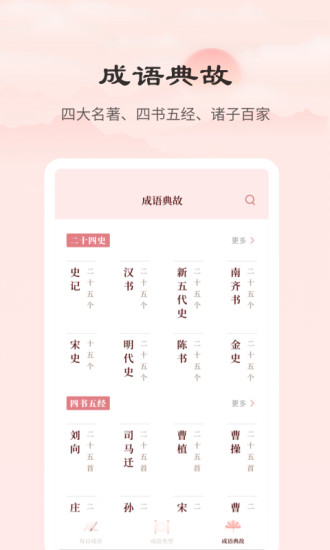 分类浏览:可以按描写季节、心情、天气、人物,出自名人、名著等方式来查看成语。这种创新的分类方式打破了传统词典按首字母排序的局限,让用户能够从不同维度探索成语世界。比如想找描写春天的成语,直接点击相应分类即可快速获取。