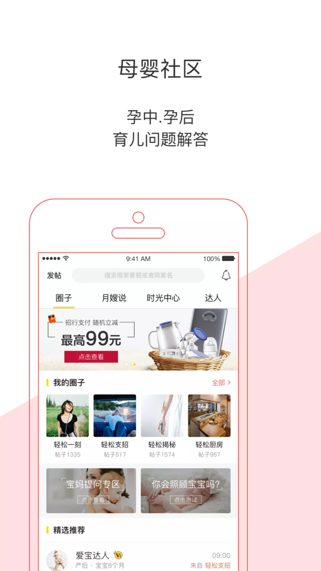 圈子:打造母婴专属社区,涵盖喂养、护理、早教等话题,妈妈们可以交流经验、解答疑惑,共同成长;