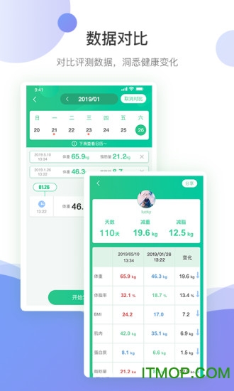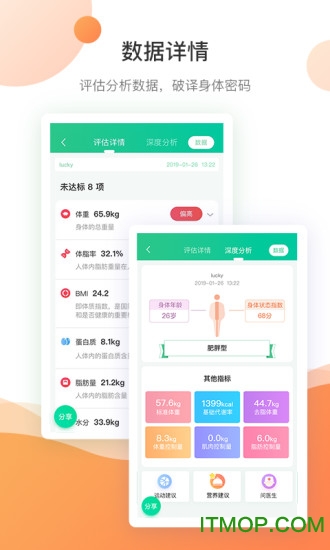 【实时评测】通过蓝牙连接智能秤,实时获取并分析身体成分数据,让用户随时掌握自己的健康状况。测量结果以直观的图表形式展示,各项指标变化一目了然。