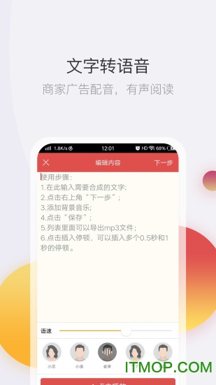 文字转语音手机软件是一款功能强大且实用的语音合成工具,能够将文字内容快速转换为高质量的音频文件。无论是商业广告、宣传文案、英语学习资料,还是个人创作的有声读物,都可以通过这款软件轻松实现语音转换。该软件不仅支持多种语音合成技术,还提供丰富的配音功能,用户可以根据需求自定义语音效果,并将成品导出为MP3等常见音频格式,方便在各种场景下使用。