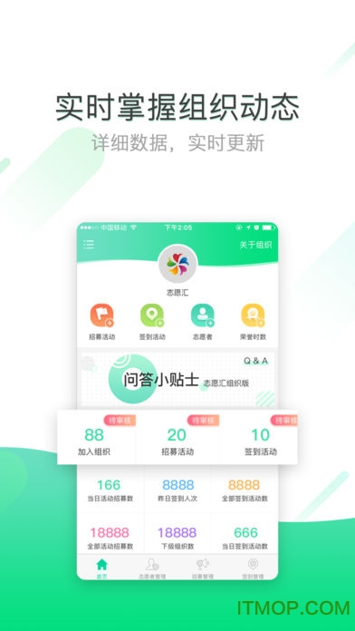 志愿汇组织版APP集成了四大核心功能模块,包括组织大数据分析、志愿者管理、招募管理和签到管理,全方位满足志愿服务组织的管理需求。
