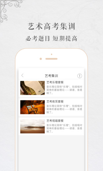 【艺考集训】包含艺考乐理套餐、艺考练耳套餐、艺考视唱套餐,为艺考生和量身打造,海量乐理、视唱练耳题库和讲义,有效帮助您学习和练习音乐基础知识;迅速提高考试成绩,让考级更容易。乐理初、中、高级,练耳初中级,视唱初中级。系统会根据用户的学习进度智能推荐练习内容,实现个性化备考。