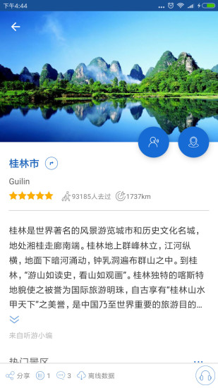 导游功能:提供步行和行车双模式导游服务,通过GPS定位精准播报每个景点的历史文化背景,让您深入了解桂林的每一处风景。