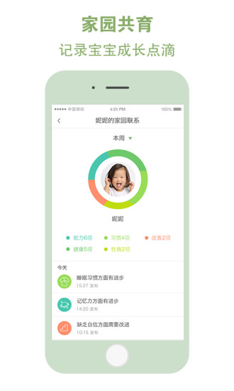 关注成长:信息传递关爱,用"精彩瞬间"凝聚宝宝的成长点滴;系统会自动生成成长报告,记录孩子每个重要里程碑。家长可以创建专属的电子成长相册,永久保存珍贵回忆。