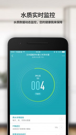 通过手机App查看云米超能净水器、云米智能冰箱等设备的大数据信息,实时监控家中自来水的水质情况、冰箱的食物状态、用户用水水量、水温状态和滤芯寿命等动态数据。系统会自动生成使用报告,帮助用户优化家电使用习惯,提高生活品质。