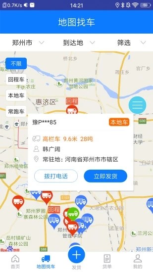 地图找车:通过智能地图功能,快速定位附近的回程车或常跑车辆,实现精准调配,降低空驶率,提高运输效率。