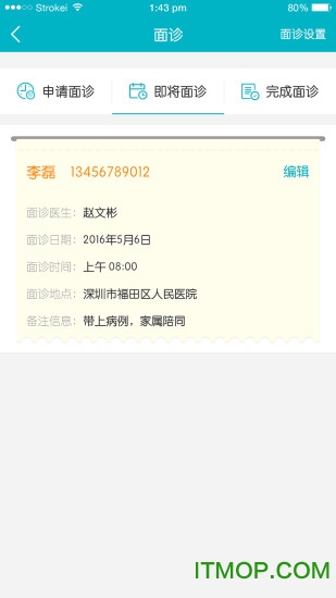 患者可以随时向支持面诊服务的医生发起面诊请求,并实时追踪面诊进度。这项服务有效解决了传统医疗中排队久、预约难的问题,让患者足不出户就能享受到专业医生的面对面诊疗服务。