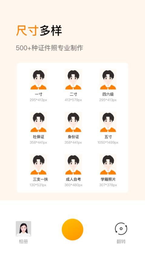 软件提供丰富多样的尺寸类型选择,从常见的1寸、2寸到各类特殊尺寸应有尽有,让您轻松找到需要的证件照规格。