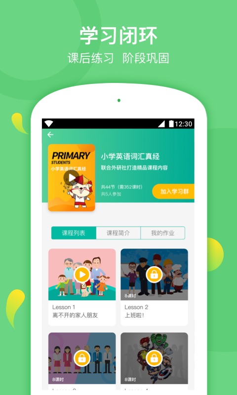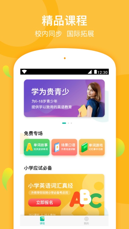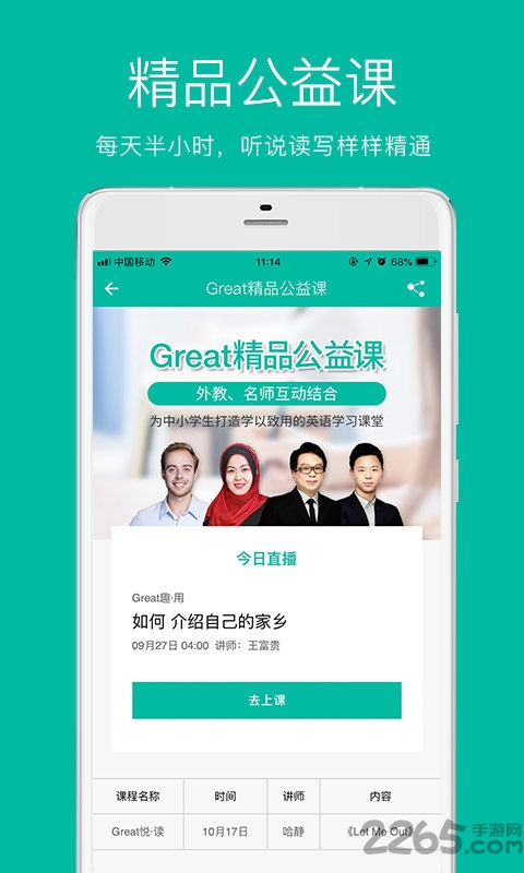 精品公益课:定期邀请名师和外教开展互动直播课,每天半小时系统训练,全面提升听说读写综合能力。
