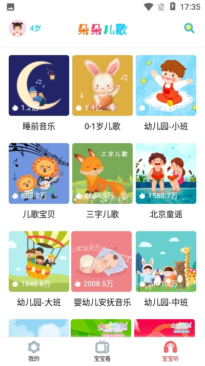朵朵儿歌,一款可以让孩子们听到很多儿歌的软件,这里有很多的儿歌,让孩子们能够喜欢上它们,培养孩子们的兴趣,让孩子们的各种的能力能够得到提高,这是非常有有意义的,想要来体验的话那就赶快来吧!