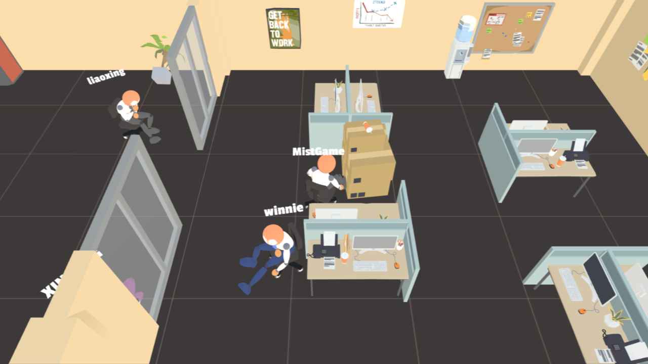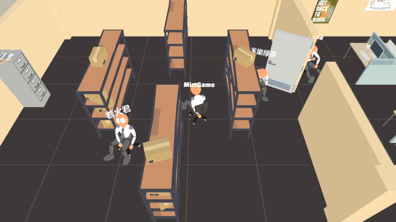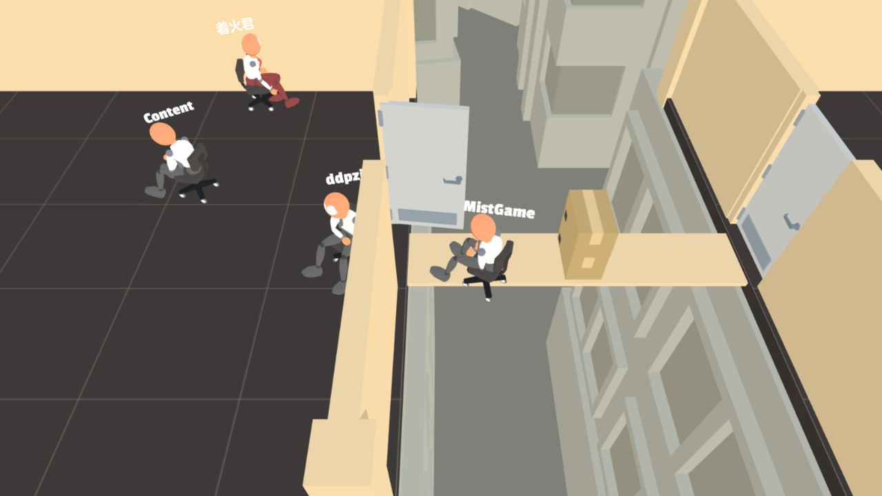 游戏角色设计采用了夸张的卡通风格,每个角色都拥有独特的造型和表情。虽然他们都穿着标准的职场装束,但夸张的发型、滑稽的表情和夸张的动作让整个游戏充满了欢乐气息。联机模式下,玩家之间可以互相恶作剧,比如突然推对方一把,或者在关键时刻干扰对手,这些互动让游戏过程充满了欢声笑语。