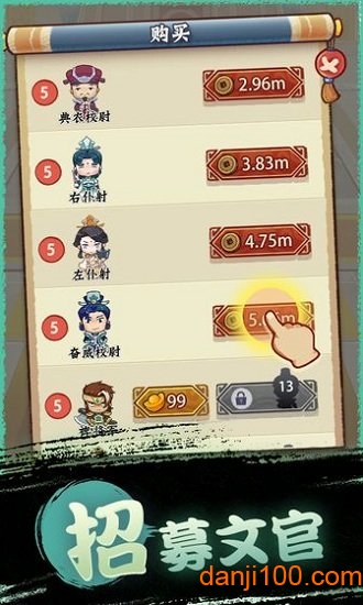 我要做主公正式版是一款以古代主公题材为背景的创新型放置类手游,游戏完美融合了合成玩法和武将收集系统,让玩家在轻松休闲的氛围中体验运筹帷幄的快感。在这款游戏中,你将通过简单的合成操作,将低等级武将逐步升级为强大的战力,同时还能收集三国时期的名将谋士,组建属于自己的强大势力。游戏采用独特的放置挂机机制,即使离线也能持续获得收益,让你在繁忙的生活中也能享受游戏乐趣。目前游戏已在单机100手游网正式上线,喜欢这款游戏的玩家不妨前往下载体验!