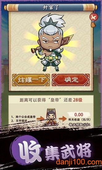 在《我要做主公》中,玩家将体验到丰富多样的游戏玩法。首先是武将收集系统,游戏收录了上百位三国时期的知名人物,每位角色都拥有独特的技能和属性,玩家需要通过多种途径收集和培养他们。其次是合成升级玩法,这是游戏的核心机制,玩家需要不断将低级武将合成为高级战力,逐步壮大自己的势力。此外,游戏还特别加入了红包奖励系统,当玩家达到一定成就时,可以获得实实在在的现金红包奖励。游戏中的社交互动也是一大亮点,玩家可以加入联盟,与其他玩家结盟合作,共同参与大型跨服争霸活动,体验真正的三国争霸快感。