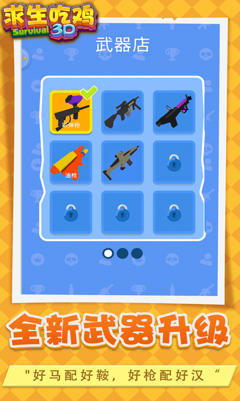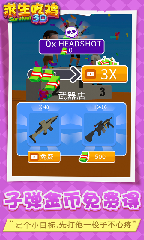 有了高倍镜可以距离远一点进行击杀。武器配件也挺重要的,决定武器命中什么的。游戏内设有武器改装系统,玩家可以根据战斗风格自由搭配枪支配件,打造专属战斗装备。原创射击玩法,加特林机枪,激光枪,喷火器各色武器加成。每种武器都有独特的射击手感和战术价值,需要玩家不断练习才能熟练掌握。等到钱抽奖,买装备,升级你的强化属性,慢慢的就会发现百发百中,吃鸡轻轻松松。游戏经济系统设计巧妙,合理分配金币用于购买装备或升级属性是获胜的关键。不断缩小安全区,激烈战斗,增强道具,击败对手升级自己,随着游戏进程推进,战斗节奏会越来越紧张,考验玩家的临场应变能力和心理素质。