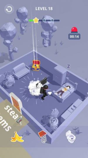 游戏包含主线剧情模式与无限挑战模式,50+个风格迥异的豪宅场景等你探索。从现代别墅到中世纪城堡,每个建筑都暗藏玄机——通风管道、地下密道甚至移动书架都可能成为你的秘密通道。通过完成每日随机任务可获得稀有装扮,定制属于你的专属神偷形象。游戏特别加入物理引擎模拟系统,你可以用绳索攀爬外墙、用磁铁隔空取物,甚至布置陷阱引开守卫,多种创意玩法打破传统潜入游戏的限制。