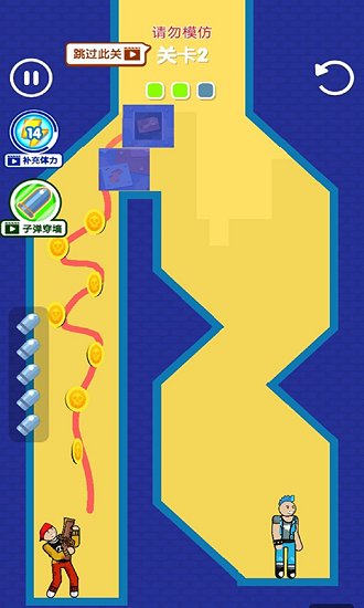 游戏的核心玩法是通过画线来展开一场场紧张刺激的对决。玩家需要灵活运用手指在屏幕上绘制线条,自由掌控子弹的飞行路径。每一发子弹的轨迹都需要精心规划,既要避开重重障碍,又要准确命中目标。游戏提供了丰富多样的场景和任务,玩家需要在不同环境中制定最佳射击方案,体验烧脑又充满成就感的战斗过程。无论是单人闯关还是多人对战,都能让你感受到策略与操作完美结合的乐趣。
