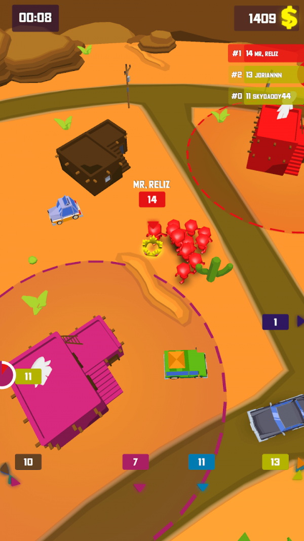 清新的游戏画风搭配独特的竞技互动玩法,为玩家带来耳目一新的体验。游戏中的创新设定让每一场战斗都充满变数,玩家需要灵活应对。操控自己的人群去占领更多房屋,不仅能扩大领地,还能扩充队伍规模,为后续战斗奠定基础。此外,你可以实时指挥每个人物,将他们分成不同队伍执行任务,策略性十足。