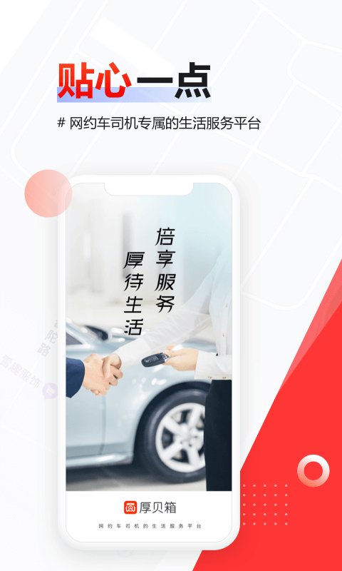 厚贝箱app是国宾科技旗下专注于国内网约车司机群体的服务平台,致力于为8000万网约车司机打造全方位的服务体验。平台以"五个一点"为核心理念,不仅提供专业的汽车后市场服务,更关注司机群体的精神需求。通过大数据分析和智能算法,平台能精准推送个性化服务内容,让每位司机都能感受到科技带来的温暖与便利。在这里,没单时的等待也能变成收获的时光。