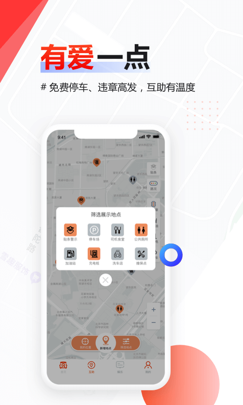 有爱一点,免费厕所导航、免费停车指引、违章高发路段预警等功能构建司机互助生态。