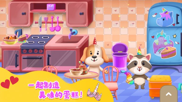 独角兽之家是游戏的核心场景之一,这个会发光的魔法树屋里住着7只性格各异的独角兽。小朋友可以参与准备彩虹主题的下午茶派对,从挑选餐具到烘焙星星饼干全程互动。每个烹饪环节都有语音引导和动画演示,连打蛋和裱花都模拟真实物理效果。