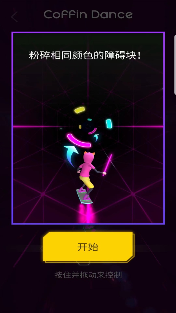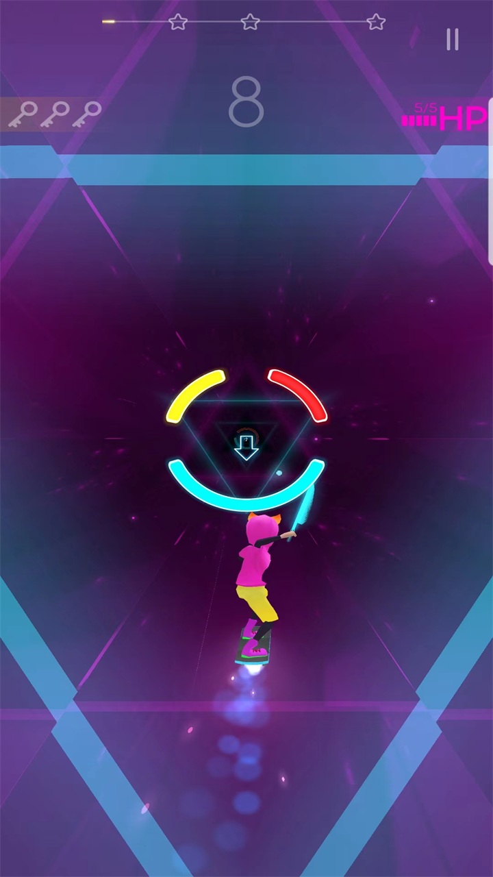 通过手指滑动控制角色在赛博轨道上左右移动,精准击碎迎面而来的节奏方块。游戏过程中需要特别注意:不同颜色的方块代表不同节奏点,必须使用对应颜色的武器才能击碎。轨道上的缝隙是致命陷阱,一旦掉落就会导致游戏失败。随着游戏进行,角色的颜色会随机变化,考验玩家的即时反应能力。掌握这些技巧后,你就能在炫目的赛博世界中尽情驰骋。
