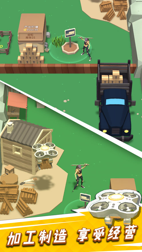 1、将获得的树木加工成木料,在无人机的帮助下送到工坊生产木制品,出售并赚取金币升级伐木场。