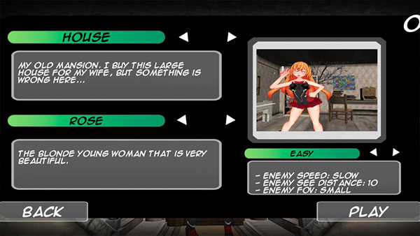 游戏开始时,玩家可以通过界面上的"house"按钮切换不同的场景地图,"easy"按钮调整游戏难度,"rose"按钮选择不同形象的妻子角色。设定完成后点击"PLAY"即可开始这场惊心动魄的冒险。游戏剧情围绕着主角试图逃离豪宅的主线展开,玩家需要在躲避妻子追捕的同时,收集十本关键日记来解开谜团。操作方面,Y键用于蹲下隐藏,L键控制角色移动,R键调整视角,右上角会显示已获得的日记数量。游戏初期,玩家可以在出生房间的桌子上找到第一个线索,隔壁房间的床上藏着第二个线索。随着探索深入,玩家可以前往楼上和楼下区域,但要时刻警惕妻子的出现。记住,保持安静和隐蔽是生存的关键。
