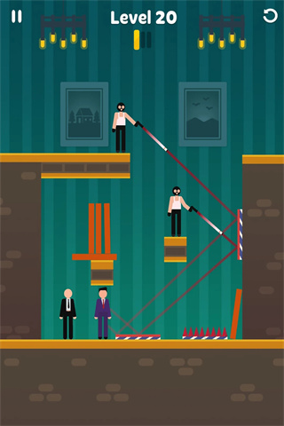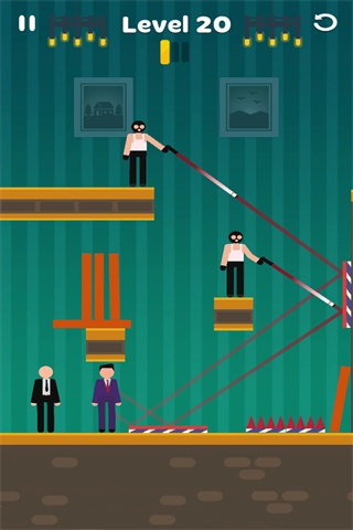 游戏采用关卡制的玩法,你需要拖动黑色衣服的角色来保护VIP角色,通过滑动屏幕控制保镖移动;