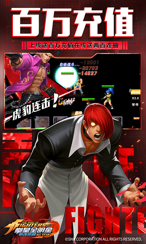 作为SNK正版授权手游,本作收录了《拳皇》《侍魂》《月华剑士》三大系列近百位经典角色。美术团队精心还原每位战士的招牌动作与必杀特效,从八神庵的紫炎到草薙京的无式,每个细节都完美复刻街机时代的经典记忆。除常规抽卡获取角色外,游戏还设计了丰富的隐藏收集要素,通过剧情关卡、特殊活动等多种渠道,让玩家享受收集全明星阵容的乐趣。