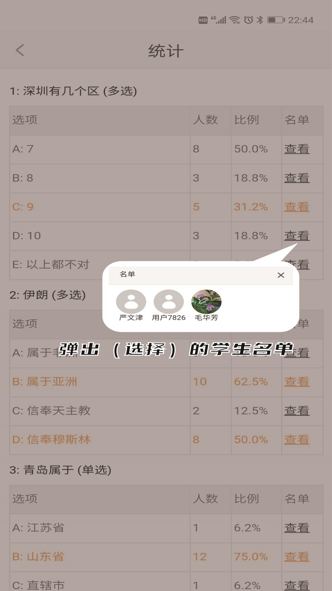 弹出(选择)的学生名单,支持按多种条件筛选学生,方便教师进行针对性指导