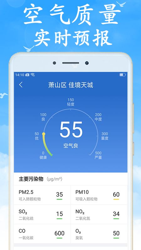 24小时实时监控空气质量指数,全面守护您和家人的健康。同时提供精准的实时天气和24小时逐小时预报,让您随时掌握温度变化。