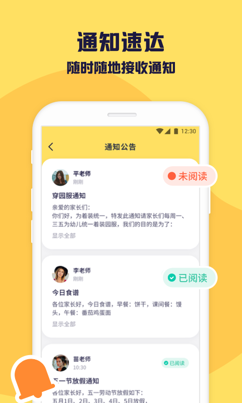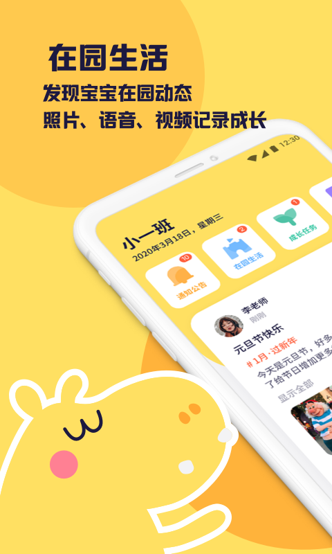 -随时了解在园情况,接收幼儿园通知等,系统支持图文、视频等多种形式的动态分享,让家长仿佛置身幼儿园现场