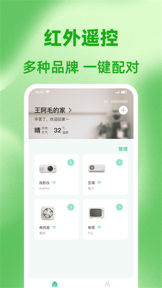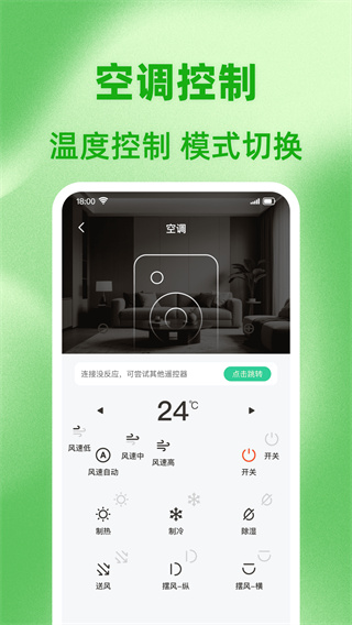 支持红外线、蓝牙或WiFi连接操控,只需将app与各种家电进行连接,如:电视、空调机等;覆盖主流家电品牌,确保用户能够轻松匹配家中各类设备。支持多个不同的家电品牌,5000+品牌的各种设备,用户无需担心不能与家中任何的设备连接;无论是新购置的智能设备还是老旧家电,都能找到对应的控制方案。易懂的操作,只需的三个步骤即可完成步连接配对,提供方便又便捷的智能使用的体验;即使是初次使用的用户也能快速上手。特别设有了场景模式的功能,用户可以自定义自己想要的模式,根据所设置的模式进行一键联动;比如设置"回家模式"自动开启空调和灯光,打造个性化生活场景。