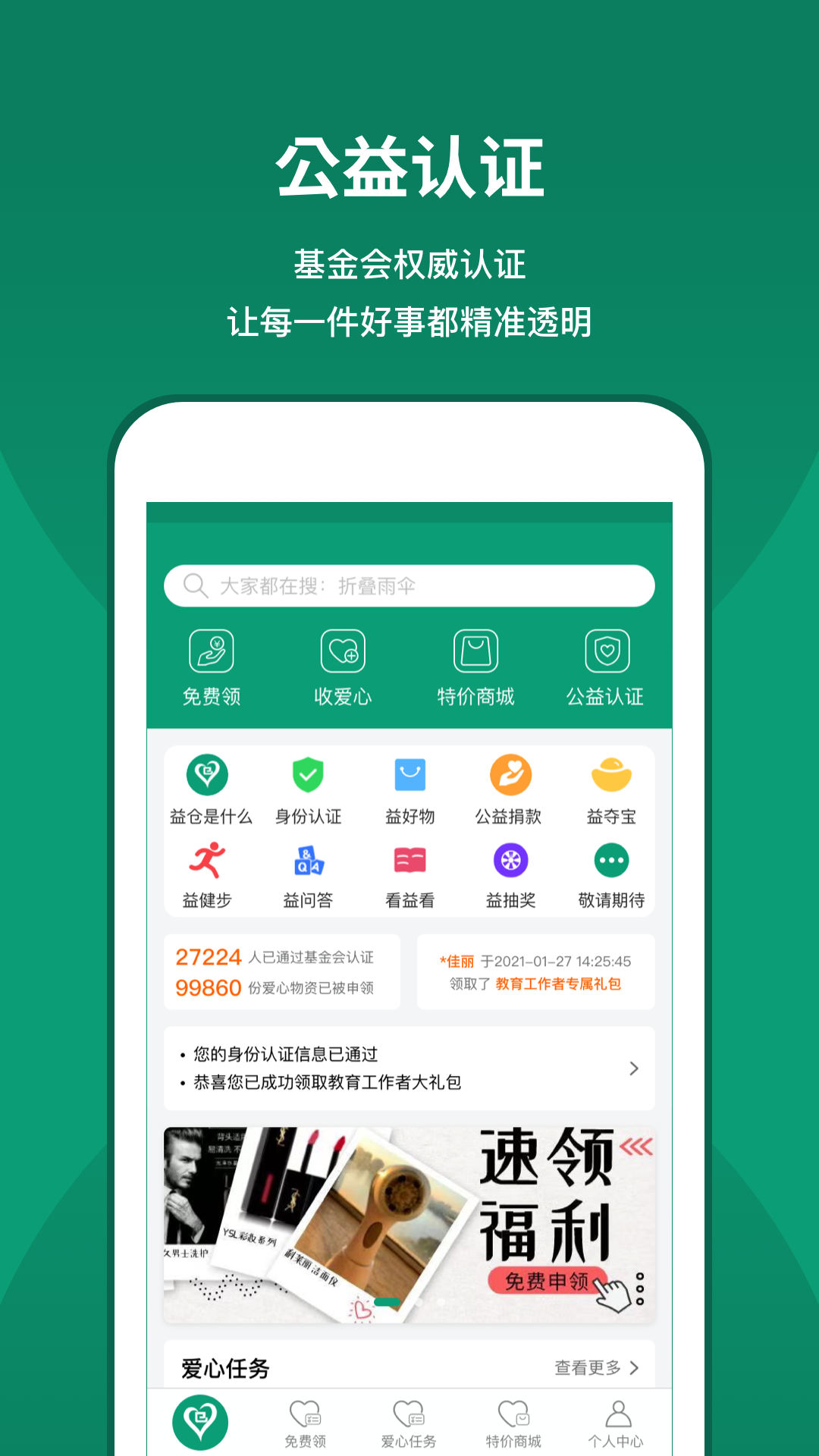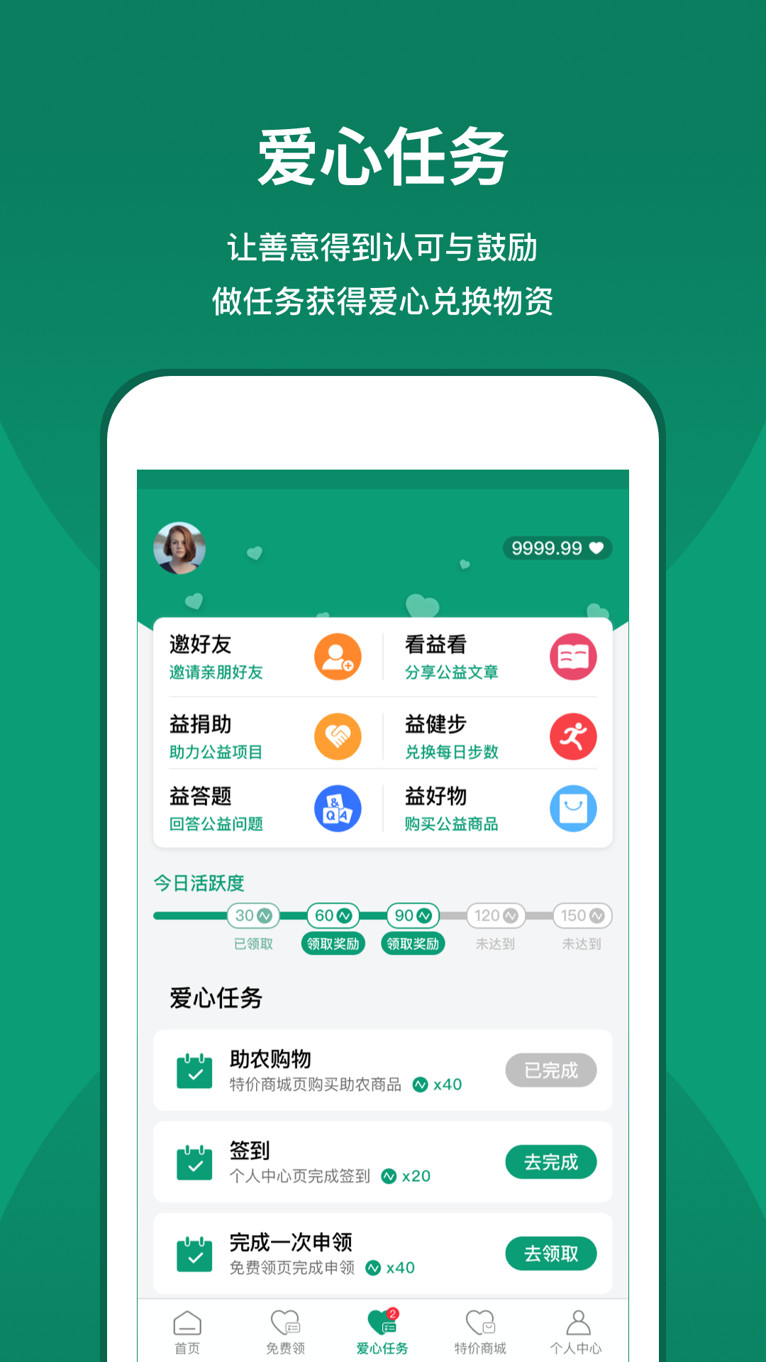 让善意得到认可与鼓励,做任务获得爱心兑换物资,每日更新30+种公益任务