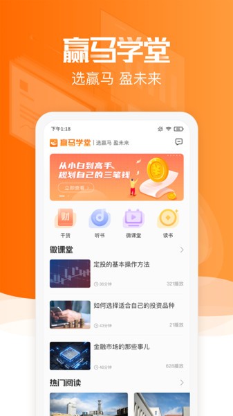 赢马学堂app是一款专注于金融理财知识普及的移动学习平台。它汇聚了海量优质课程资源,涵盖投资策略、财富管理等实用内容,通过生动有趣的教学方式帮助用户轻松掌握理财技能。平台实时更新行业资讯与市场动态,搭配专业讲师团队指导,打造您的随身理财课堂。无论是理财新手还是资深投资者,都能在这里找到适合自己的学习路径,实现个人财富管理能力的快速提升。