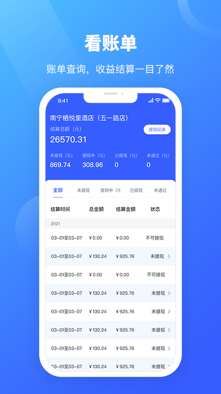看账单功能为商家提供清晰透明的财务数据,支持多种查询方式,让收益结算一目了然。系统会自动生成详细的财务报表,帮助商家精准掌握经营状况。