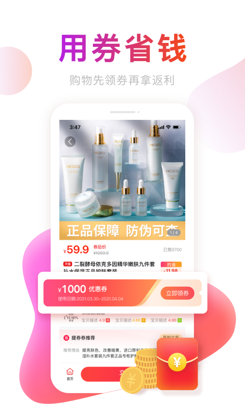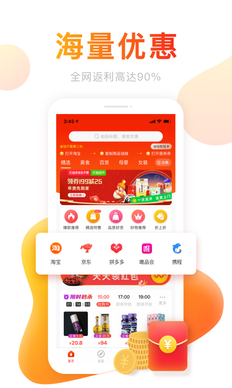 品质好货、精选特惠、折上折栏目分类清晰,让你发现更多购物惊喜。返佣比例最高可达50%,提现秒到账无门槛。每月18号的"超级返利日"活动,返利金额翻倍,还有限时免单抽奖。专属的VIP会员体系让您享受更高比例的返佣和专属客服服务。