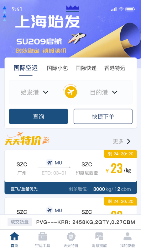 友舱网国际空运物流服务APP是专为外贸企业、跨境电商和物流从业者打造的智能工具。除了支持在线订舱、代理订舱和实时空运价格查询等核心功能外,该APP还提供精准的物流信息追踪服务,让用户随时掌握货物动态。通过先进的技术手段和专业的服务团队,友舱网为用户带来更高效、更透明、更安全的国际物流体验,显著提升跨境贸易的便利性。