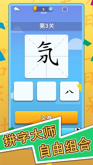 游戏采用极简的操作方式,只需轻松点击即可完成所有操作,让每位玩家都能快速上手体验。在畅快闯关的过程中,你需要充分发挥脑力解答各种汉字谜题,成功闯关还能领取丰厚奖励,成就感满满。游戏设计了令人上瘾的挑战内容,从第一分钟开始就让你欲罢不能,趣味性十足的游戏体验定会让你爱不释手。此外,游戏还融入了传统文化元素,让玩家在娱乐中感受汉字之美。