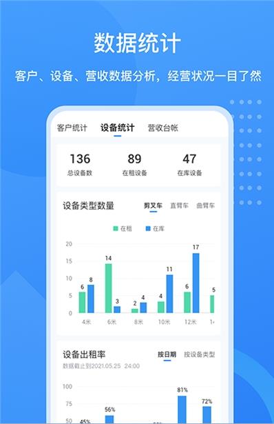 专业的工程机械设备租赁平台,辅助租赁商随时管理多方面工程机械设备,支持多种设备类型接入;