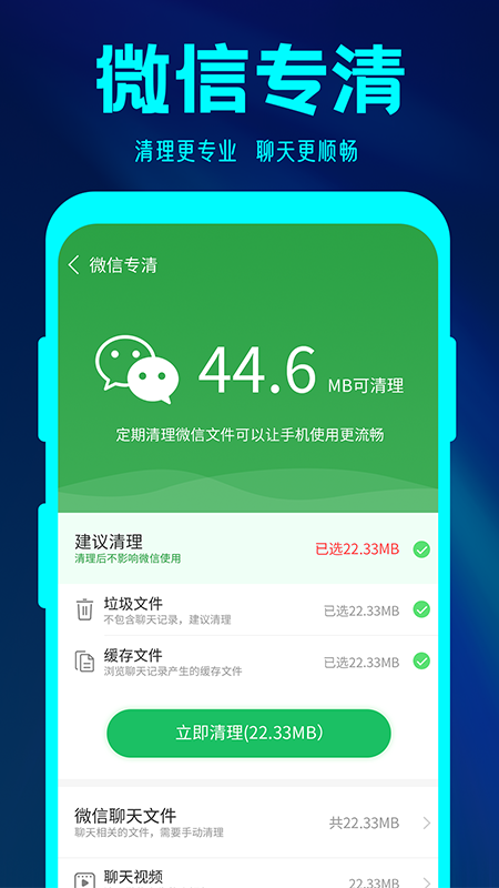 【专清】针对微信等社交应用进行深度优化,可清理聊天图片、视频、表情包等无用缓存,大幅提升微信运行速度,让聊天更顺畅。