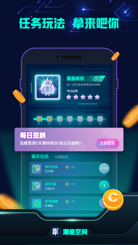 潮能空间APP是一款融合了游戏化元素的创新电商平台,为用户带来前所未有的盲盒购物体验。在这里,你可以以超值价格购买各类盲盒,每个盲盒都保证含有优质商品,绝不会出现空盒的情况。平台汇聚了海量潮流好物,从热门IP周边到限量版潮玩应有尽有。通过独特的游戏化玩法设计,让每一次购物都充满惊喜与乐趣,更有丰富的优惠活动和任务奖励等你来探索,让购物变得更有趣、更划算。