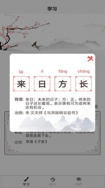 每天精选一个成语,提供详细注释、出处和使用场景,帮助用户循序渐进地积累成语知识,培养良好的学习习惯。
