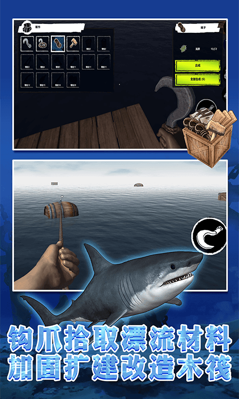 《木筏求生者》是一款极具沉浸感的海洋生存模拟游戏,将玩家抛入危机四伏的开放海域。你将从一片孤零零的木筏开始,面对无尽的波涛与潜伏的威胁。通过精准投掷锁钩打捞漂流物资,从塑料瓶到木板碎片都可能成为救命稻草。游戏独创动态生态系统,昼夜交替中既要应对鲨鱼的突袭,又要提防突如其来的风暴。每一次扩建木筏、每一件手工武器都关乎生死存亡,真实还原了海上求生的残酷与智慧。