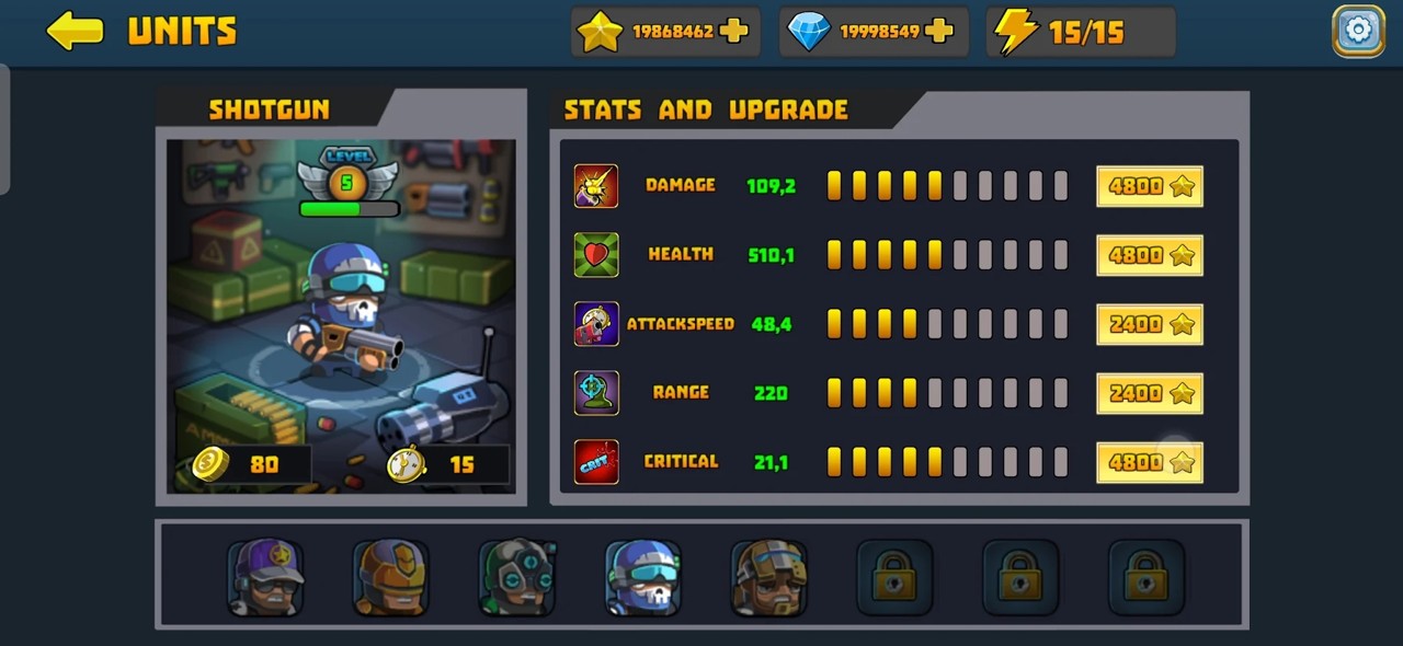 游戏的核心玩法是带领小队成员阻止僵尸前进,同时要尽量减少后方队友受到的伤害。完成关卡任务后,玩家可以获得星星和宝石奖励,这些资源可以用来强化战士的各项能力。玩家可以通过放置玩法组建一支强大的军队,与各种僵尸怪物展开激烈的枪战对决。游戏中还设计了多种拥有特殊能力的怪物,为战斗增添了更多变数。其中神枪手角色装备了威力巨大的霰弹枪,虽然射速较慢但射程远、伤害高。游戏中共有8种不同类型的僵尸,每种僵尸都具备独特的属性特征,包括移动速度、攻击力和生命值等。